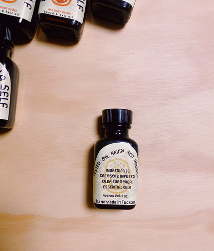 Groom Ya Self Hair and Beard Oil is a nourishing oil blend infused with the healing properties of creosote. This creosote infusion is also where this hair and beard oil gets its desert rain aroma. Use it on bearded faces or in hair to moisturize ends and tame fly-aways.